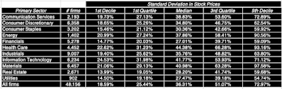 2. Standard deviation in price changes: This is a standard statistical construct, and measures volatility in a stock, though it does not distinguish between upside and downside volatility. Based upon the company-specific standard deviations, again averaged out across sectors, here is what the numbers looked like in 2025: