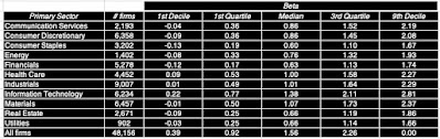 Financials and utilities are the two safest sectors, and technology and health care are the riskiest, if you measure risk with standard deviation.3. Betas: If you buy into the notion that the investors setting prices are diversified, and thus care only about risk that cannot be diversified away, you will focus only on the portion of the standard deviation in a stock that comes from the market, and betas, notwithstanding the misinterpretations and misreading, are trying to measure that non-diversifiable portion of standard deviation and scale around one. Again, looking across industries, I look at the distribution of betas, by sector: