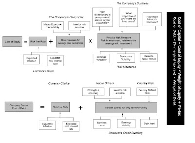 In the context of a business, which raises money from debt and equity, you can look at hurdle rates through the eyes of the capital providers – a cost of equity, capturing what equity investor believers expect to make on other equity investments of equivalent risk, and a cost of debt, looking at what lenders can earn on lending to others with similar default risk: