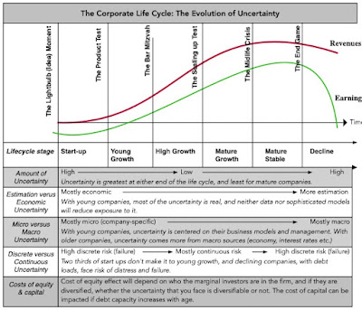 I compute the costs of equity and capital for all 48,156 firms in my sample, and in doing so, and in the interests of consistency and ease, I make some simplifying assumptions:Once I have the costs of equity and capital for each firm, I compute industry averages, both for global firms, and by region (US, Japan, Europe, Emerging Markets, with India and China as sub-categories). You can find the links to the data at the end of this post, but there is another perspective that you can bring to the cost of capital discussion, based upon where a company falls in the company life cycle: