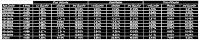 Intuitively, you would expect more uncertainty about business prospects with younger firms, than older ones, especially on the estimation front. That said, it is an open question of whether this uncertainty will translate into higher costs of equity and capital, since it depends on who the marginal investors in these firms are, and whether the risk is diversifiable (and not affect cost of equity) or non-diversifiable. To answer these questions, I classify firms into ten deciles, based on their corporate age, and compute costs of capital: