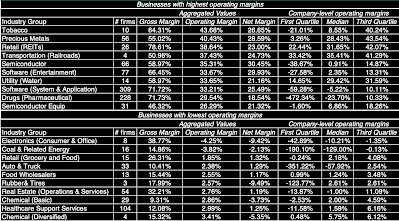 At one end of the spectrum, you have industry groups like basic chemicals, which has an aggregated (median) gross margin of 9.31%, making the margin hill much steeper to climb, since operating margins and net margins will be lower. At the other end of the spectrum, in addition to tobacco and railroads (surprised, right?), you have system and application software, delivering an aggregated gross margin of 71.72%, operating margin of 33.21% and net margins of 25.49%, capturing the strong unit economics that characterize the business.