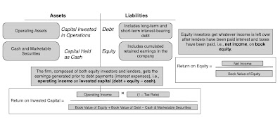 If we define the threshold for business success as generating profits, we are setting the bar too low for a simple reason. Starting a business requires capital, and that capital can earn a return elsewhere on investment of equivalent risk. If those words sounds familiar, it is because I used them in my last post on hurdle rates to describe the costs of equity and capital. Thus, value creation requires a business to generate a return on its equity (capital) that exceeds its cost of equity (capital). That is a simple proposition, and a powerful one, but the measurement challenge we face is in determining the returns that companies generate, and for better or worse, we are dependent on accounting measures of these returns. A good way to see what an accounting return is measuring or at least trying to measure is to look at returns on equity and invested capital in a financial balance sheet: