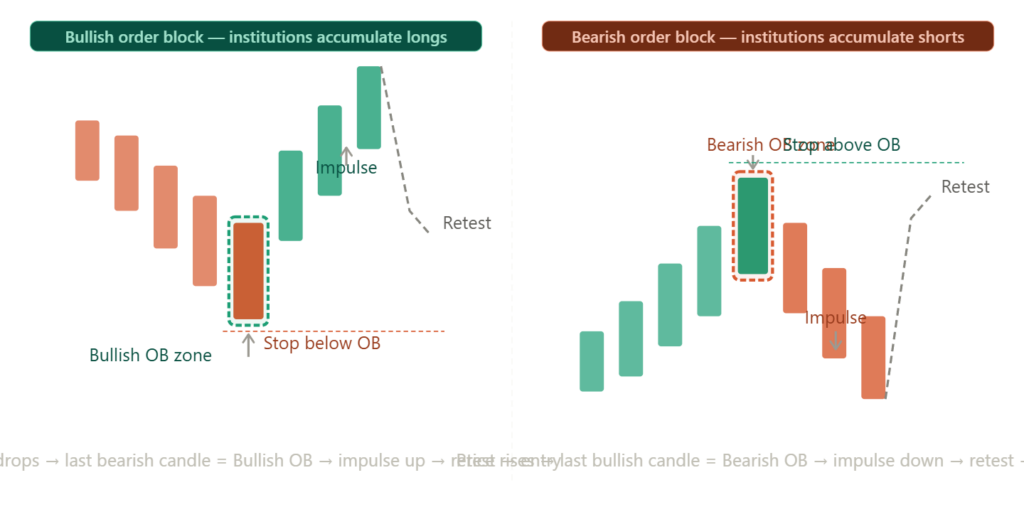 Alt text: Side-by-side diagram showing a bullish order block on the left — the last bearish candle before an upward impulse, with a retracement entry zone and stop below — and a bearish order block on the right — the last bullish candle before a downward impulse, with retracement entry and stop above.
