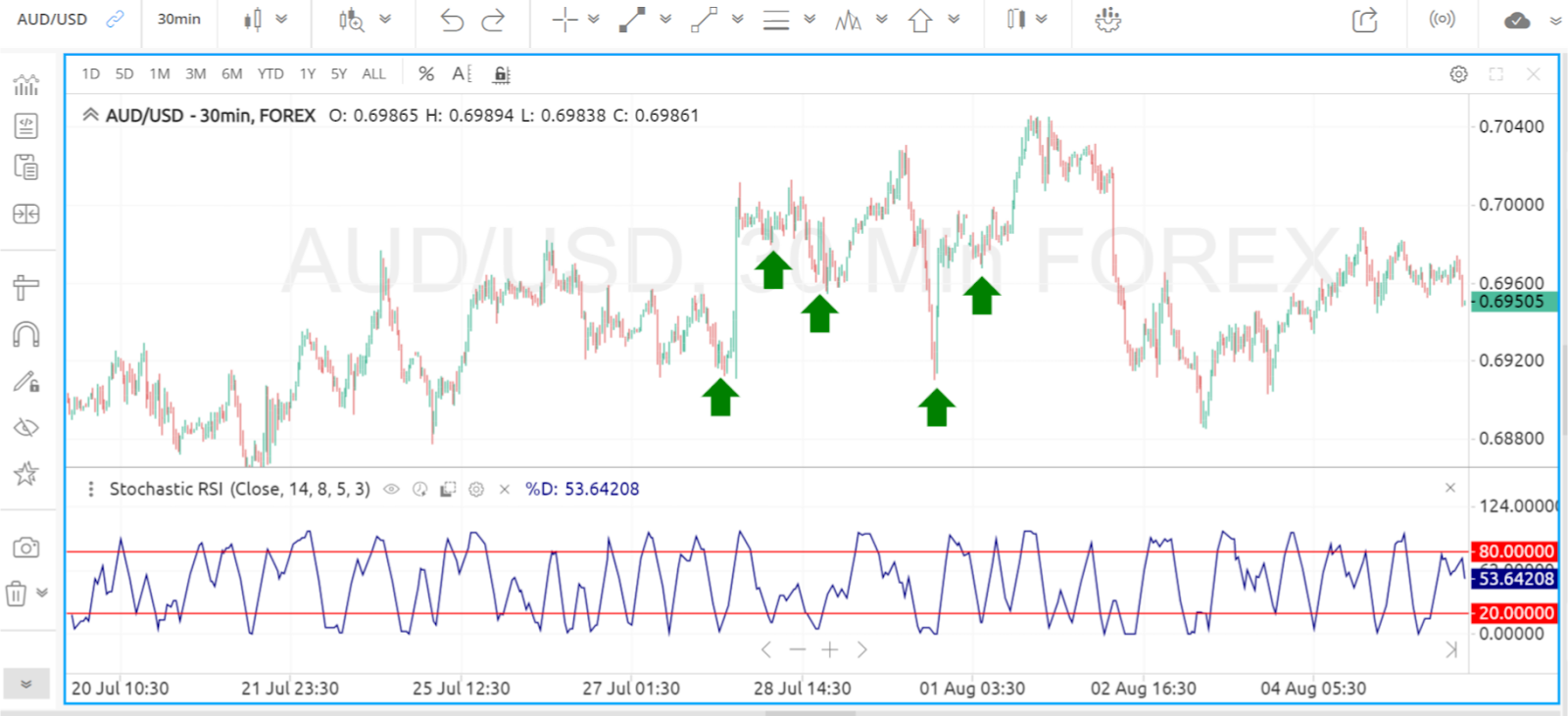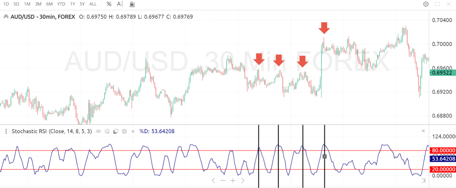 Now, identifying these conditions isn’t as daunting as it sounds. All you have to do is find out if the Stochastic RSI is moving below or above the overbought or oversold conditions and you’re all set.