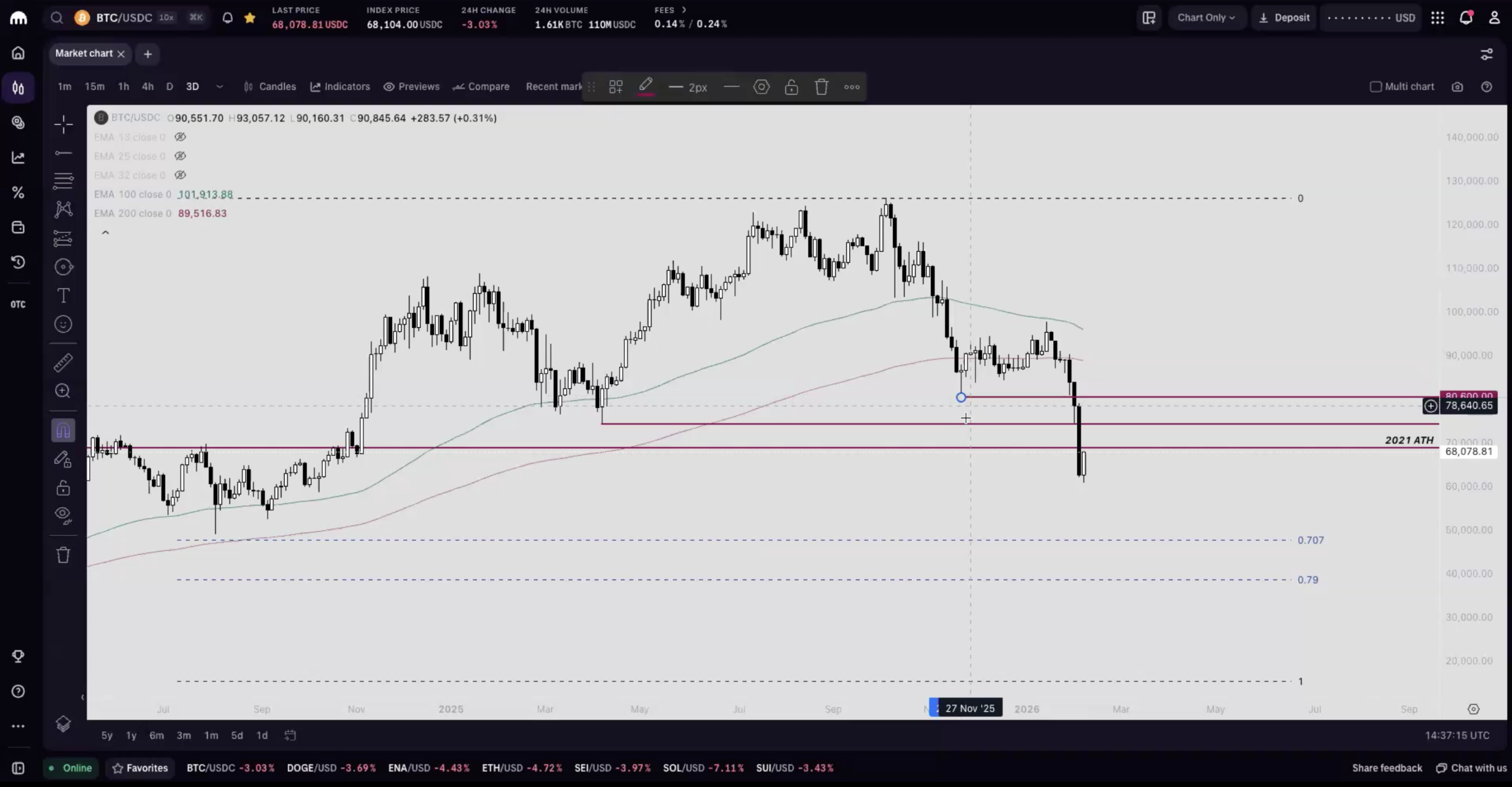 Important framing from Den: this is not a prophecy. It’s a confluence map — the kind of zone that becomes relevant if the market continues to unwind.