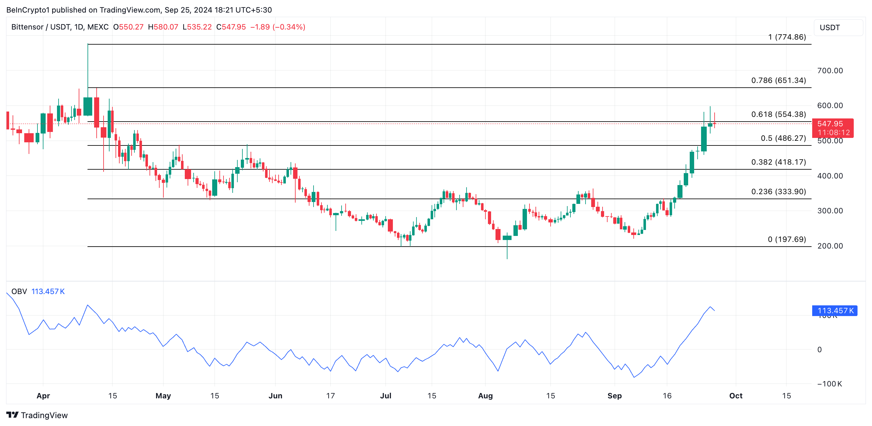 TAO currently enjoys a significant bullish bias, as evidenced by its rising on-balance volume (OBV). When an asset’s OBV rises, it indicates that buyers have the upper hand in the market. It suggests that buying pressure is high, and traders and investors are confident in the asset’s potential to increase in value.