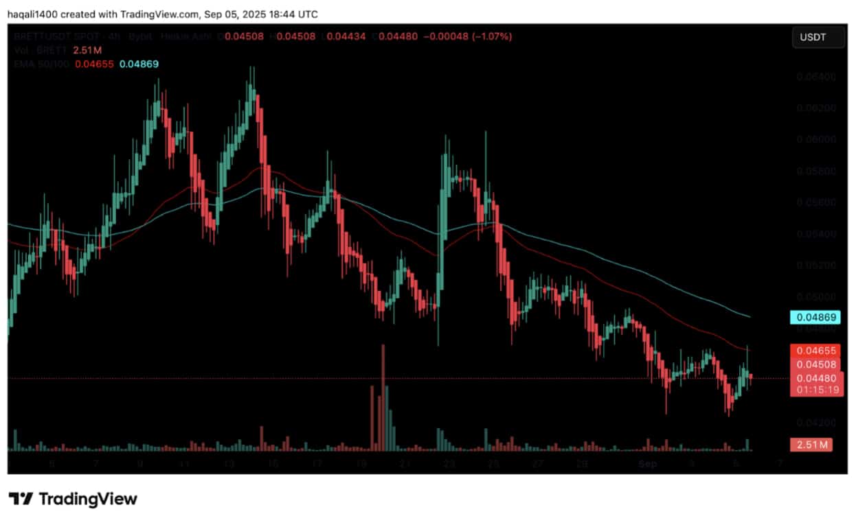 According to Tradingview, Brett (BRETT) trades at about $0.04479, with a daily volume near $32.9M and a market cap of roughly $444.6M.