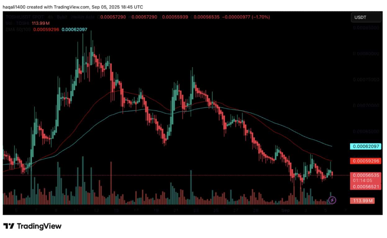 Toshi (TOSHI) changes hands at around $0.0005653. It records about $10.25M in daily volume and carries a market cap of $237.8M.