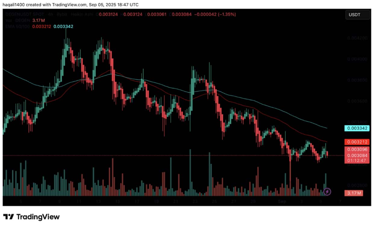 Degen (DEGEN) is priced close to $0.003087. It sees about $11.56M in daily trades and holds a market cap of $114.3M.