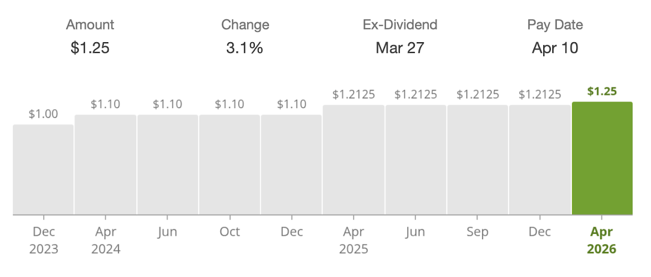 Sporting Goods (DKS) increased its dividend by 3.09%, from $1.2125 to $1.25 per share.