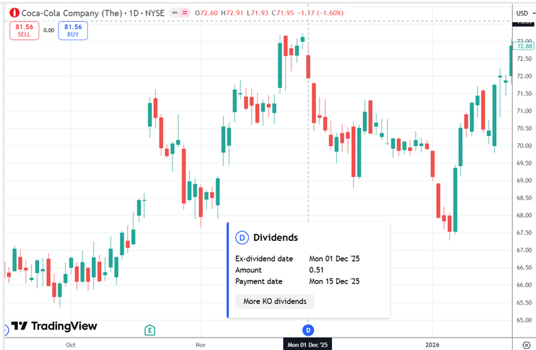 With the Earnings and Dividends icons enabled in TradingView, we see that Coca-Cola has an ex-dividend date on Monday, December 1st, 2025.