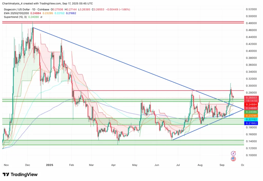 Dogecoin price prediction is heating up as the coin jumps 20% monthly, holding strong above the $0.25–$0.26 support zone after last week’s dip from $0.30. Traders are buzzing over the first U.S. Dogecoin ETF set to launch tomorrow, a milestone that could invite hefty institutional inflows and spark a fresh rally.