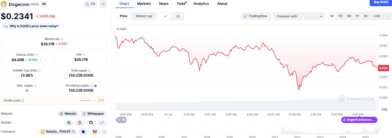 At the time of writing, Dogecoin is trading at $0.234, down from recent highs and sitting below the key resistance level of $0.245.