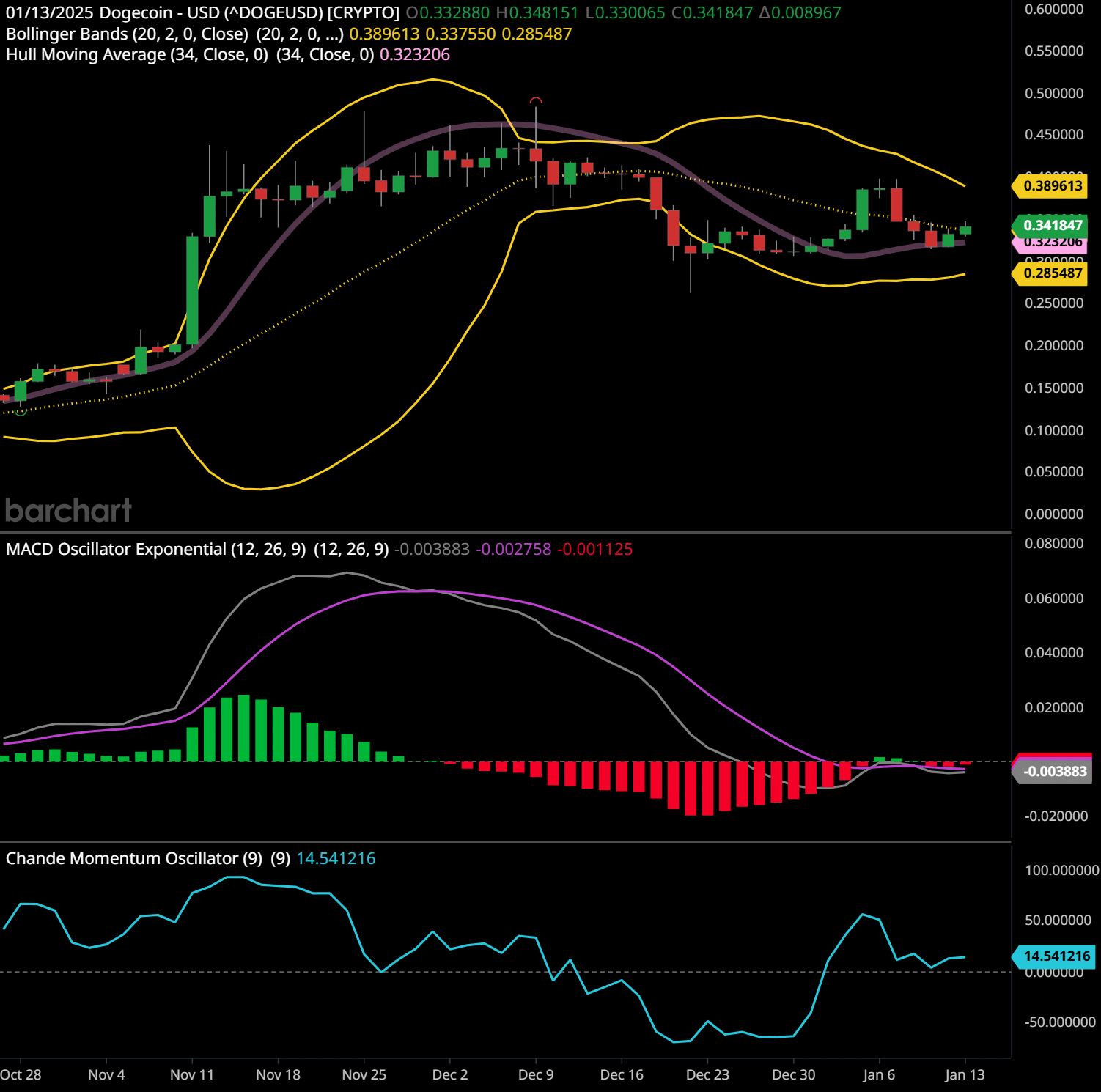 This chart shows DogecoinDogecoin (DOGE) is a cryptocurrency that started as a joke but has grown into a widely recognized and somewhat prominent digital currency within the crypto space. Here are the key … (DOGE) on a daily time frame, incorporating Bollinger BandsJohn Bollinger, a financial analyst and trader, invented Bollinger Bands in the early 1980s. He designed this technical analysis tool to measure market volatility and provide insig…, a Hull Moving AverageThe Hull Moving Average (HMA) is a technical analysis indicator developed by Alan Hull, a finance and investment analyst, to reduce the lag associated with traditional moving avera…, the MACDThe MACD indicator is essentially a momentum indicator that shows the relationship between two different moving averages of price. The MACD is the difference between the 12-period …, and the Chande Momentum OscillatorThe Chande Momentum Oscillator (CMO) is a technical indicator that measures momentum in a financial instrument. Developed by calculating the difference between the sum of recent ga… (CMOThe Chande Momentum Oscillator (CMO) is a technical indicator that measures momentum in a financial instrument. Developed by calculating the difference between the sum of recent ga…). Here’s a detailed breakdown: