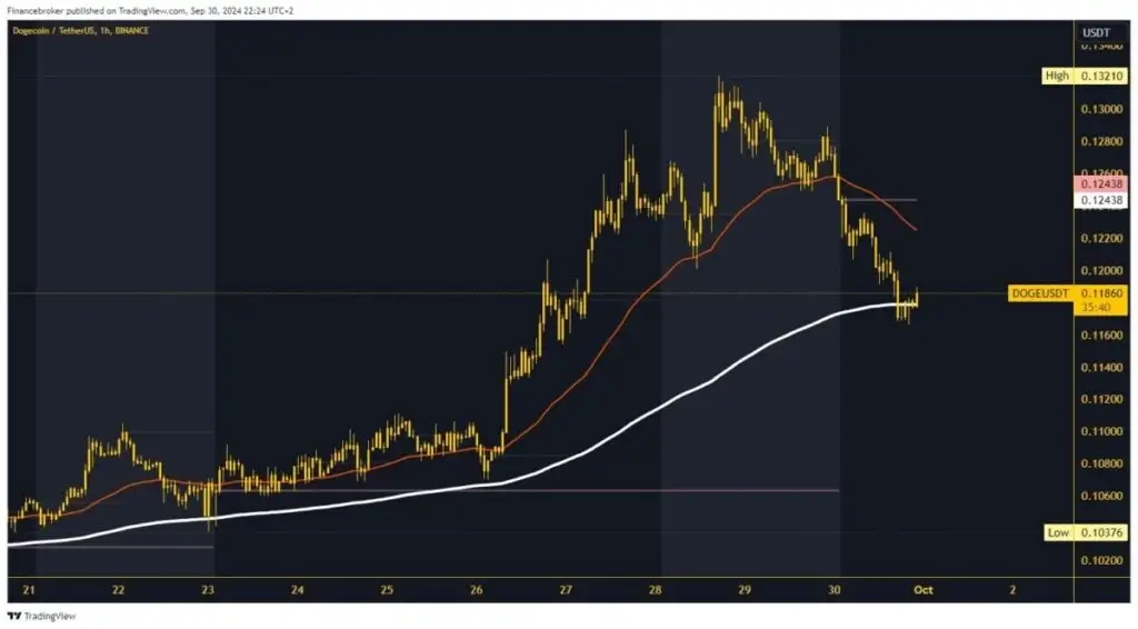 On Saturday, the price of Dogecoin rose to 0.13210, a new two-month high. Shortly after that, we saw the initiation of a bearish consolidation and a drop on Sunday below 0.12400 and the EMA 50 moving average. Monday brought more pressure on the price, which continued to fall towards the 0.11600 support level. For now, Dogecoin has managed to stop further pullback and return above the 0.11800 level.