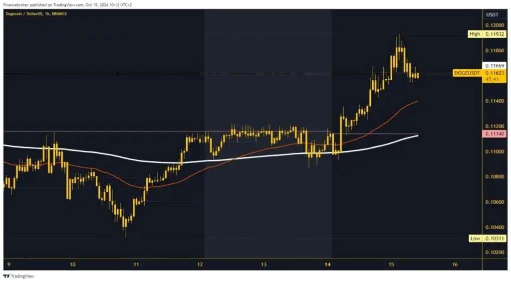 Over the weekend, Dogecoin’s price moved in the 0.11000-0.11200 range. On Monday, the price initiated a bullish consolidation and received support from the EMA 200 moving average. The price growth continued until this morning when we formed a new high at the 0.11932 level. The price lost momentum in that zone and began to retreat below the daily open level. We are now on the negative side and have formed a new daily low at 0.11550.