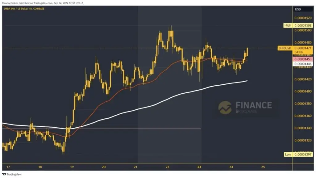 The Shiba Inu price rose to 0.00001508 on Sunday, setting a new September high. After that, there was a stop at that level, and a pullback was initiated to the 0.00001420 support level. On Monday, the price recovered again, this time to the 0.00001485 level. We could not continue further, and the Shiba Inu returned to support at the 0.00001430 level.