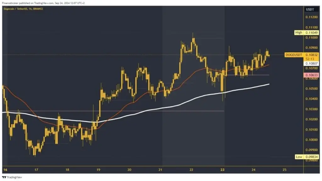 On Sunday, the Dogecoin price rose to 0.11049, a new weekly high. Soon after, the price began a pullback down to 0.10500 and the EMA 200 moving average. We got that new support, from which started the bullish consolidation on Monday to the 0.10900 level. After that, Dogecoin took a step to new support at 0.10600 and formed a new bottom there.