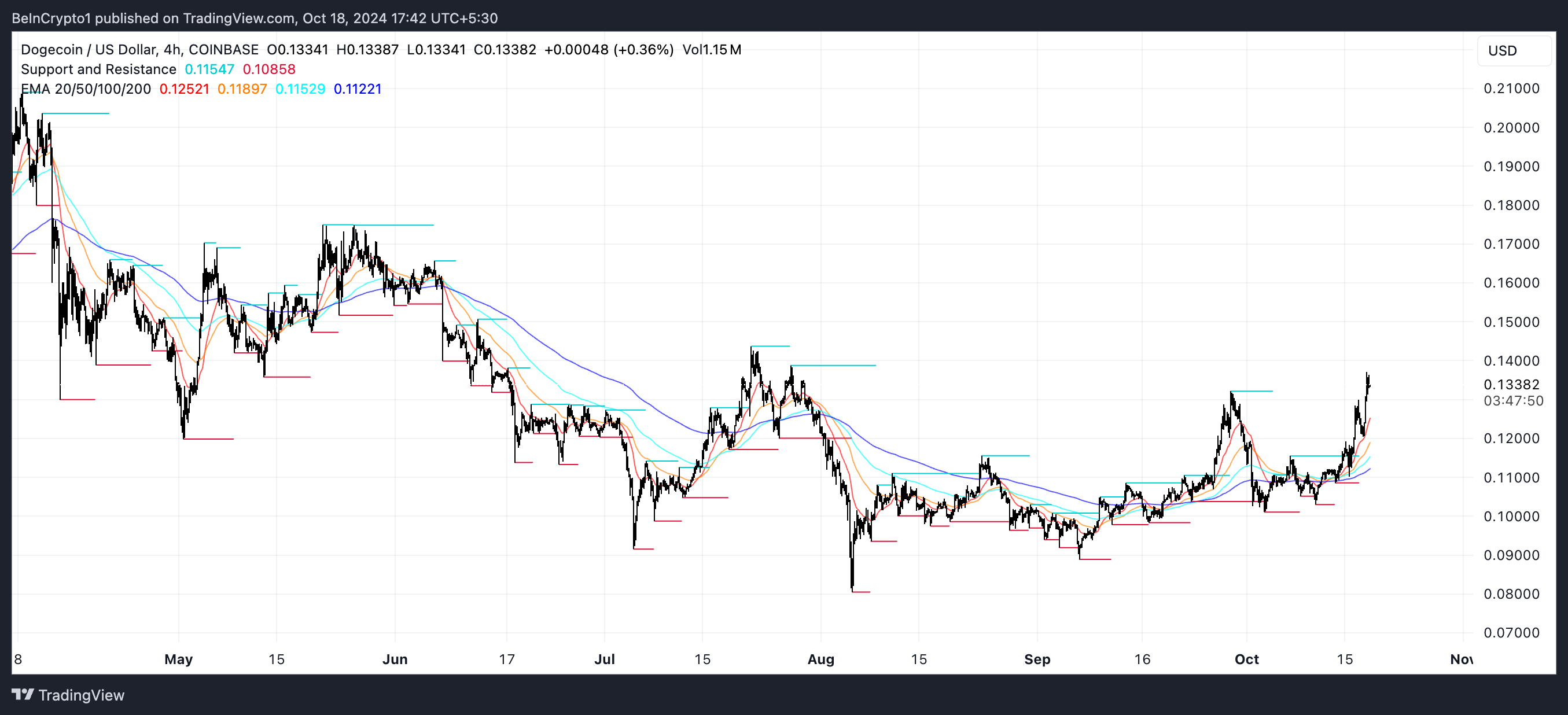 If DOGE’s current uptrend continues and strengthens, DOGE price could potentially test the $0.14 level and even challenge the resistance at $0.175—its highest price since May. This movement would represent a roughly 30% increase from current levels, showing the strength of the upward trend indicated by the EMA lines.