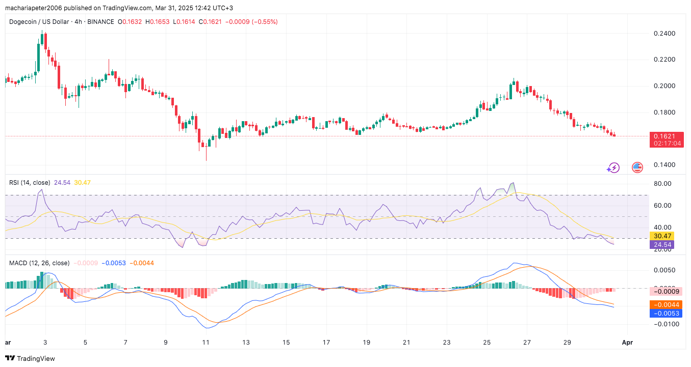 Dogecoin fell to $0.1614 due to renewed bearish pressure, as technical indicators like RSI and MACD turned negative. This decline followed a short-lived 10% rally earlier in the week.