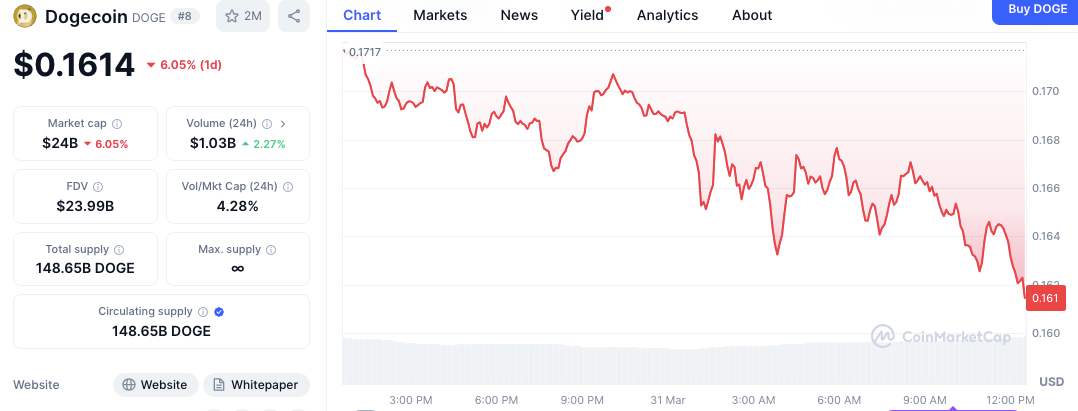 After trading as high as $0.1717, Dogecoin has fallen to $0.1614 as of the time of writing, recording a 6.05% 24-hour decline. The drop follows a downward movement throughout the day, losing some of its recent weekly gains. While trading volume has raised 2.27% to $1.03 billion, this uptick has not been enough to halt the price decline.