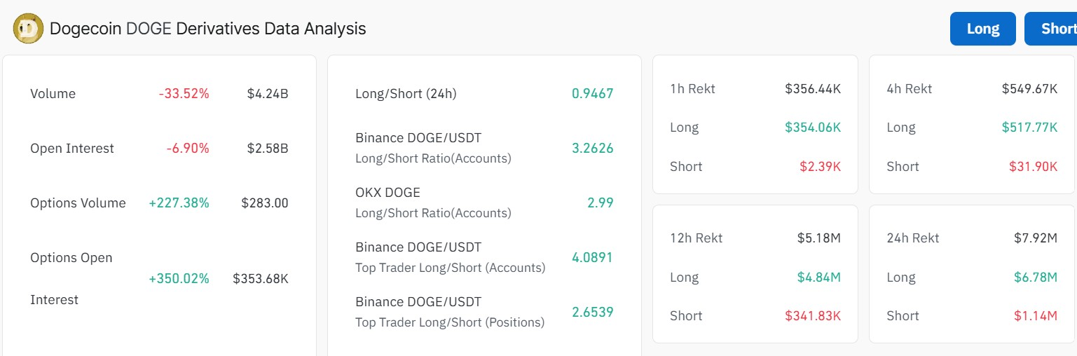 Dogecoin traders saw liquidations totaling almost $7 million in the derivatives market. Rekt says $6.78 million in those losses were long positions while short positions were $1.14 million.
