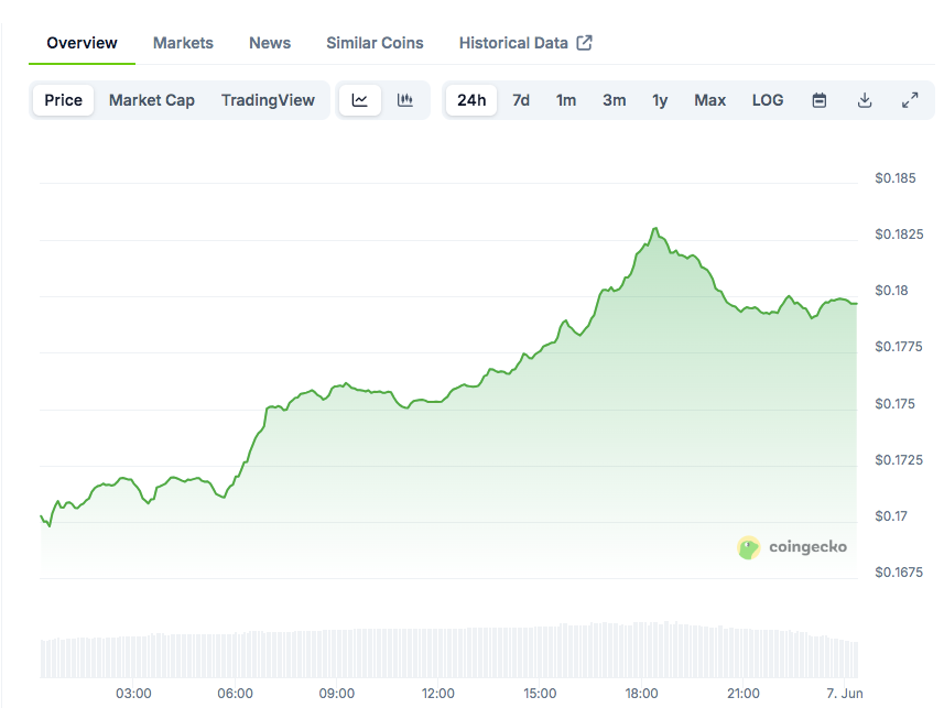 Based on recent data from CoinGecko, the Dogecoin price stands at $0.1798 as of June 6, 2025. It recorded a 5.42% increase in the last 24 hours. However, the token remains down 10.05% over the past seven days, reflecting earlier market volatility.