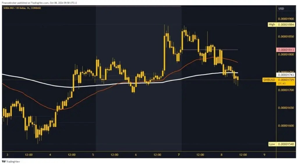 During the previous weekend, the Shiba Inu price managed to climb to 0.00001884. After that, we saw a short pullback to the 0.00001780 support level. From that level, we bounce back to 0.00001880 on Monday but fail to hold there. Shiba Inu is making another pullback from there and broke support at 0.00001780 last night. This morning, the price continued to fall below the EMA 200 moving average, which increases the bearish pressure.