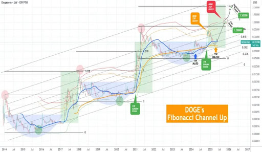 TradingShot notes that Dogecoin’s current price behavior remains consistent with past market cycles, where, after testing the MA200, the meme coin began a sustained rally. The Channel Up structure has also historically guided the altcoin’s price movements, with major cycle tops coinciding with Fibonacci Extension levels.