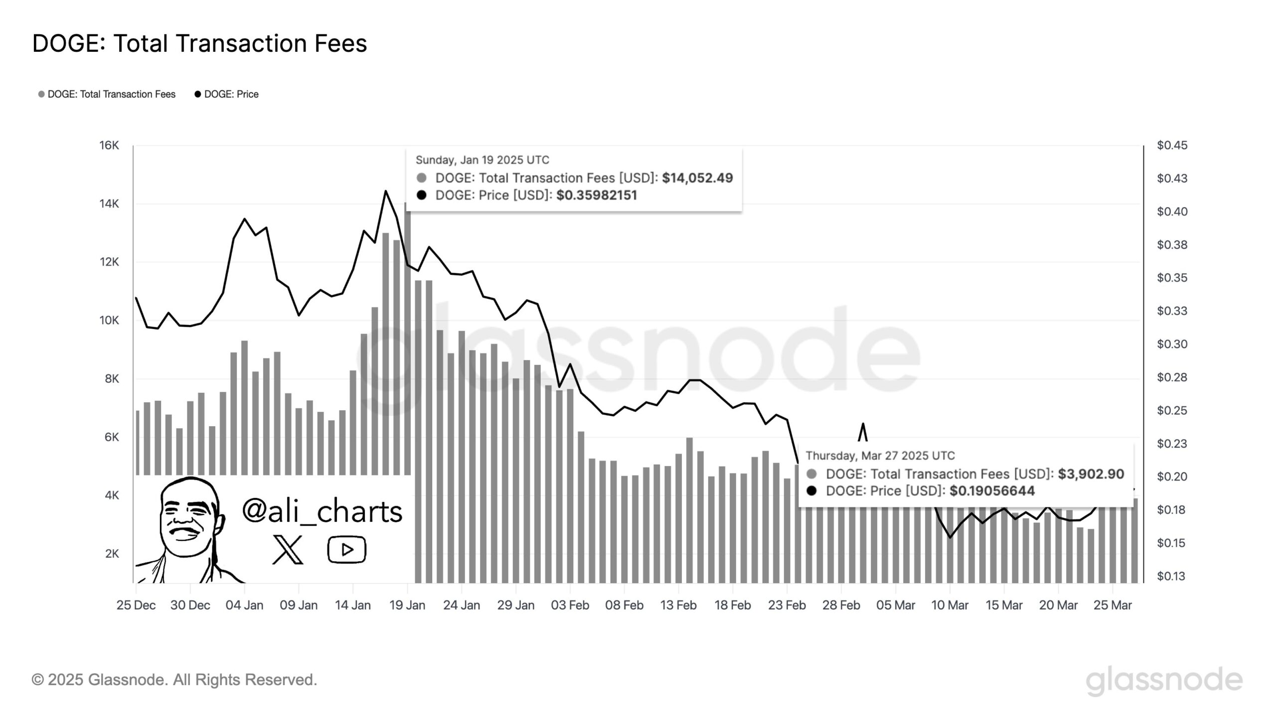 Dogecoin price has completed 41,132 transactions throughout the last 24 hours, according to a recent report by crypto analyst Ali. The average transaction cost reached 0.534 DOGE through this operation, amounting to $3,900 based on current market prices.