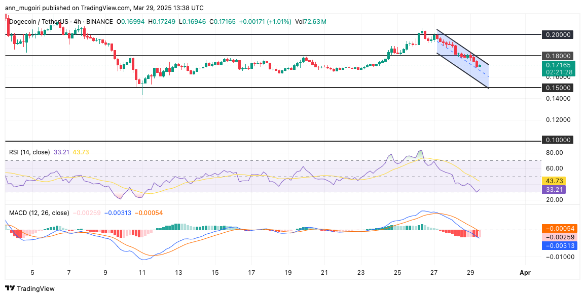 At the time of writing, the DOGE price is trading at $0.1709, with a 5% decrease over the past 24-hours. This Follows the decrease in other crypto markets, With BTC hovering around $83k and ETH trading below $1,9 support levels.