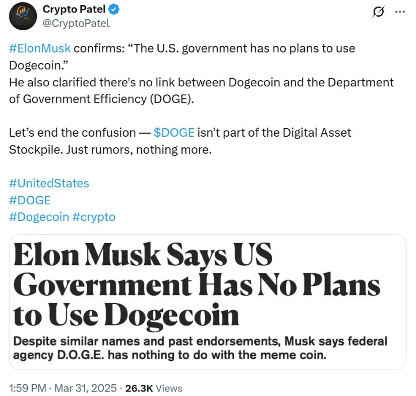 Elon Musk confirmed that the U.S. government has no plans to use Dogecoin and dismissed any link between DOGE and federal agencies. Source: Crypto Patel via X