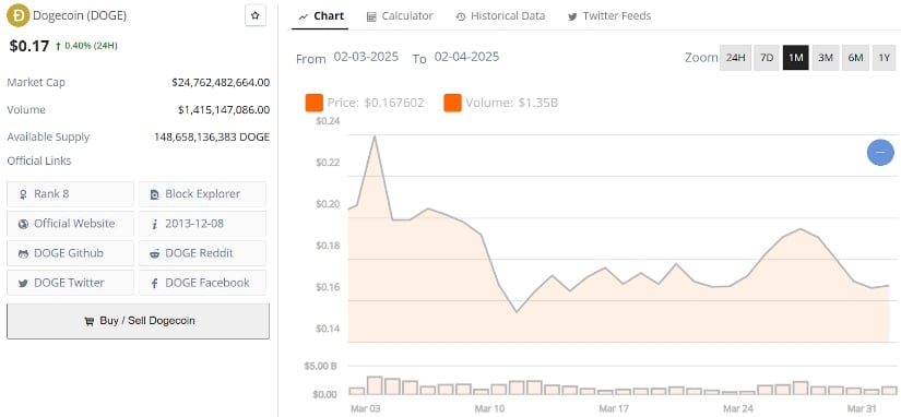 Dogecoin has been struggling to maintain its momentum, currently trading around $0.1731 after recovering from a dip to $0.16. The cryptocurrency’s performance has been hampered by broader market concerns, including rising global economic uncertainty. Traders are bracing for further volatility as U.S. President Donald Trump’s tariff policies come into focus.