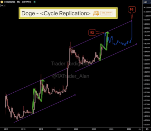 Trader Tardigrade also raised the possibility of the Dogecoin price rallying to as high as $2 in this cycle. He revealed that DOGE is replicating its previous cycle, with a similar parallel line from the last cycle unfolding again. The crypto analyst remarked that this is no coincidence and asserted that $2 is a reasonable target for the 2025 cycle.
