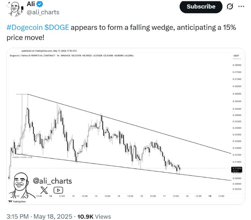 Dogecoin (DOGE) is forming a falling wedge pattern, signaling a potential 15% breakout move. Source: Ali Martinez via X