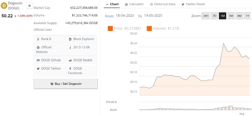 Dogecoin (DOGE) is trading at around $0.22, down 1.03% in the last 24 hours at press time. Source: Brave New Coin