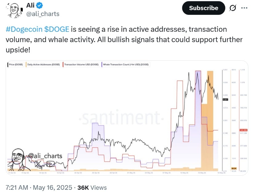 Dogecoin ($DOGE) is experiencing a surge in active addresses, transaction volume, and whale activity, indicating strong bullish momentum. Source: Ali Martinez via X