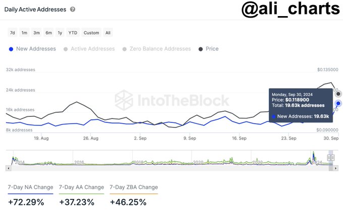Crypto analyst Ali Martinez shared IntoTheBlock data showing that the Dogecoin network has experienced significant growth over the past week. This provides a bullish outlook for the Dogecoin price. The analyst stated that there has been a 72% increase in the number of new DOGE addresses. He added that 19,630 new addresses were created on September 30.