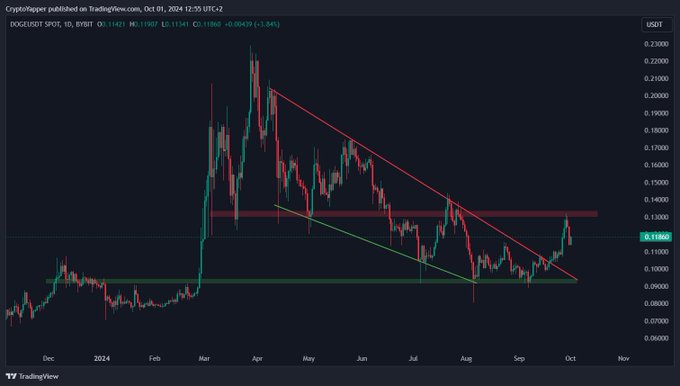 Meanwhile, DOGE could also face significant resistance between $0.13 and $0.14. Crypto analyst Crypto Yapper stated that the meme coin has already been rejected at this critical horizontal level. He further suggests that this will be the major price range that DOGE will need to break as it rises to $0.15.