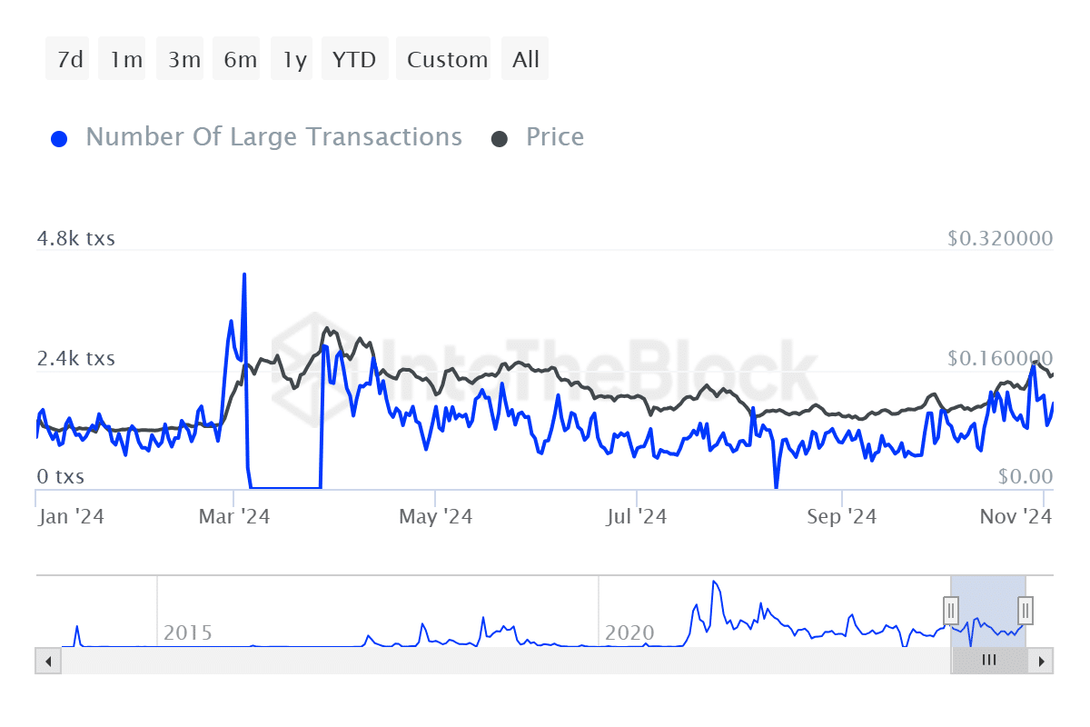 - Recent data showed a notable spike in large transactions and trading volume for DOGE, reaching its highest levels last week.