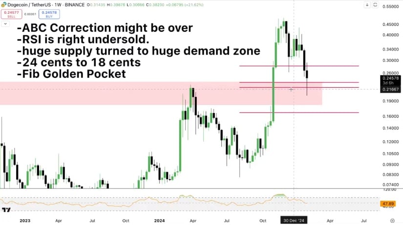 Furthermore, Fibonacci retracement levels show that DOGE’s current price aligns with a historically significant support zone, further strengthening the argument for a rebound. “The golden pocket perfectly aligns with our top supply zone,” he explained, adding that such confluence increases the probability of an upward move.