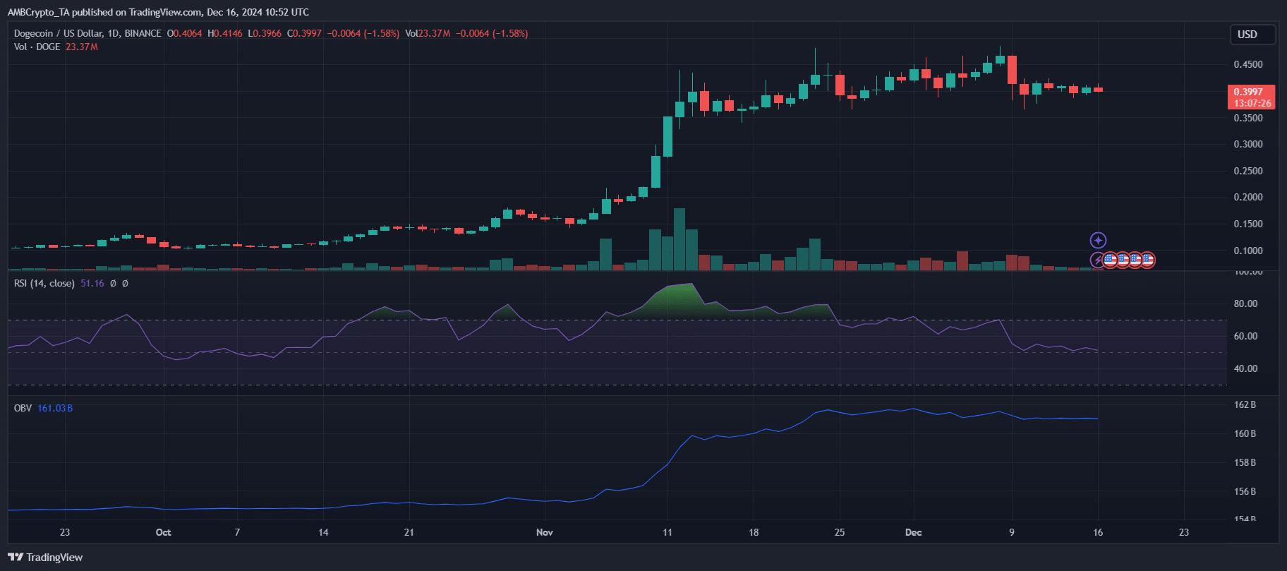Trading at $0.3997 at press time, Dogecoin’s volume trends indicate weakening momentum, with diminishing buying pressure compared to earlier in December. Meanwhile, the RSI has dipped toward neutral territory at 51.16, reflecting waning bullish strength.