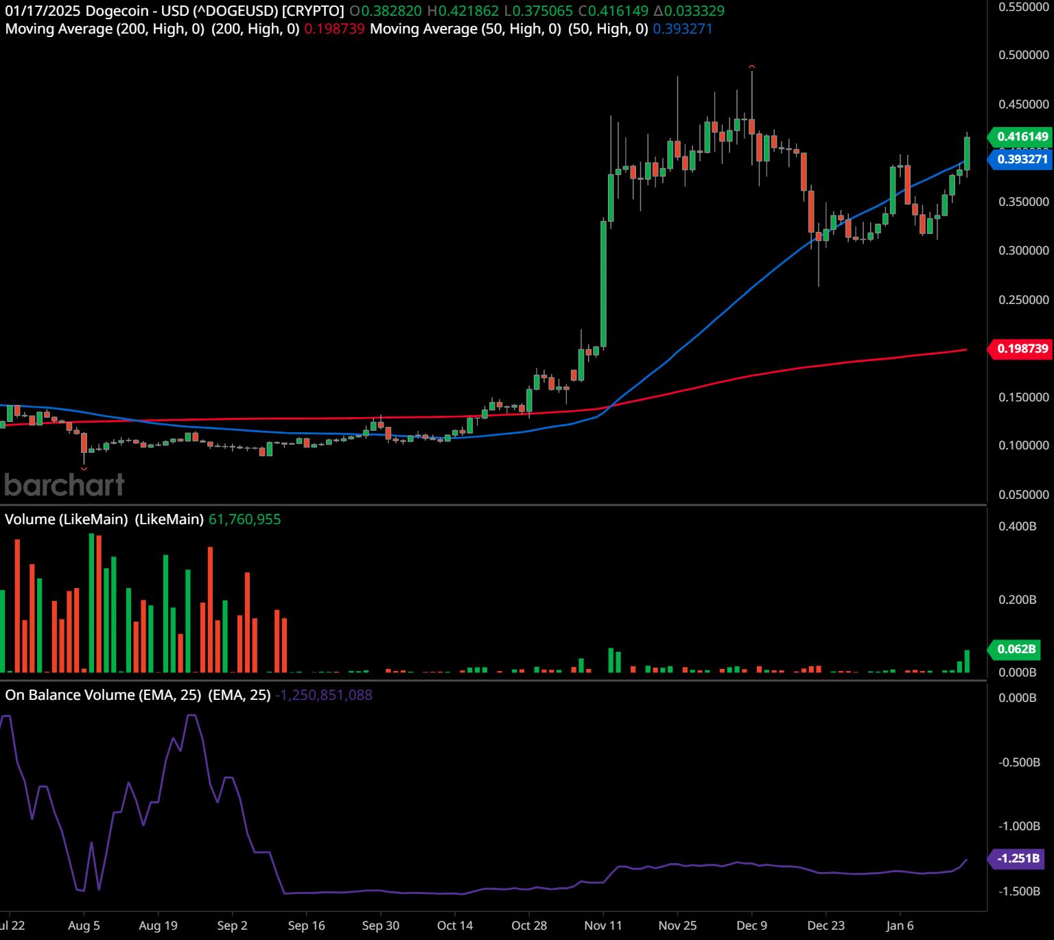 Price Action and Trend Analysis: DogecoinDogecoin (DOGE) is a cryptocurrency that started as a joke but has grown into a widely recognized and somewhat prominent digital currency within the crypto space. Here are the key … has experienced significant bullish momentumMomentum in stock trading refers to the rate of acceleration of a stock’s price or trading volume. It indicates the strength of a trend and measures how quickly prices are rising o… since mid-December 2024. After consolidating in a sideways range between July 2024 and late November 2024, DOGE broke out in December, marking a substantial price increase. This price surge led to a fresh high in early January 2025. The current price of DOGE stands at around $0.4161, with an ascending trendline forming since late December 2024, indicating a continued uptrend.