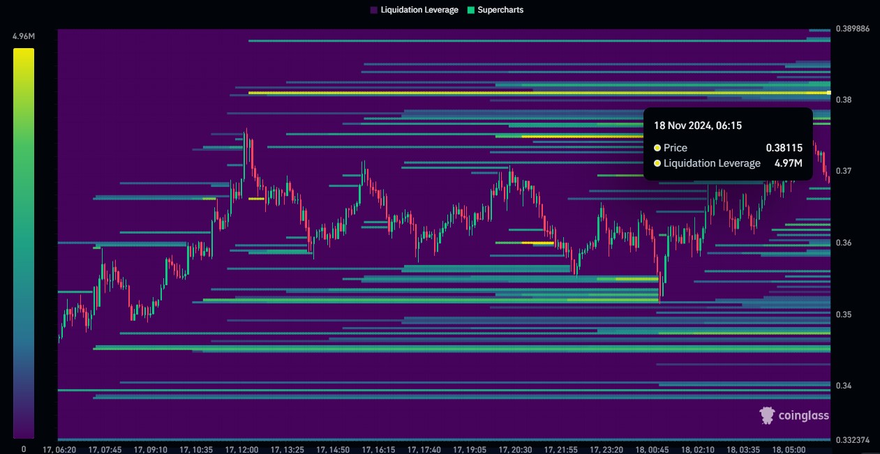 Besides the aforementioned positive sentiments, our analysis of recent Coinglass data revealed significant liquidation leverage at current levels, with a liquidation pool of 4.97M at the $0.3812 price level.