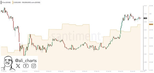 Crypto analyst Ali Martinez recently revealed in an X (formerly Twitter) post that whales purchased approximately 140 million DOGE tokens on the last day. The analyst shared a Santiment chart showing the increase in whale activity by holders with balances between 1,000,000 and 100,000,000. The trend in the chart indicates a surge in Dogecoin whale holdings, particularly leading into January, correlating with a rise in the meme coin’s price.