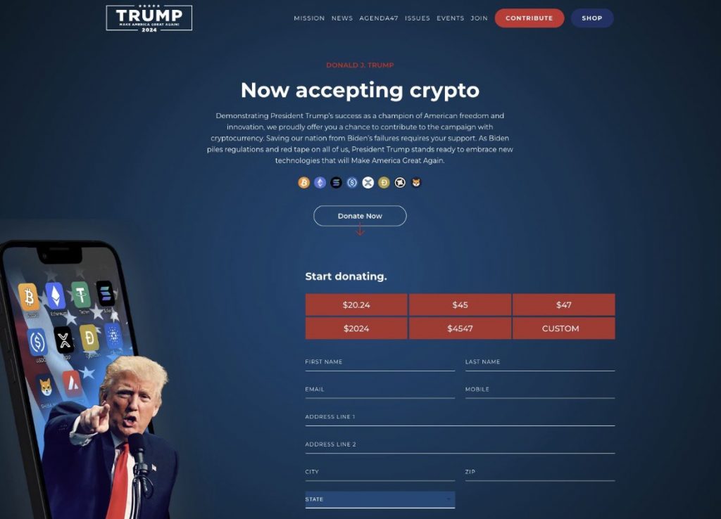 Trump has also started accepting crypto donations for his political campaign. This decision aligns with his pro-crypto stance. It allows supporters to contribute using Bitcoin, Ethereum, and other cryptocurrencies, including meme coins $DOGE and $SHIBA. Accepting crypto donations is a strategic move. It appeals to a tech-savvy audience and shows his commitment to modernizing political funding. This approach also bypasses traditional banking systems, which can be slow and expensive.