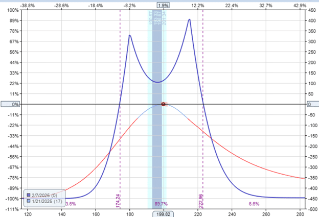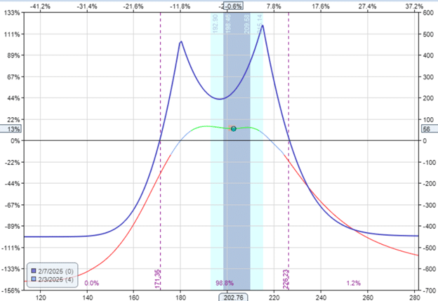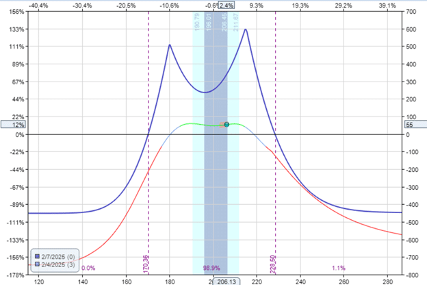 We don’t want to hold the trade through earnings because a large price move might put the price outside the expiration graph’s profit tent.