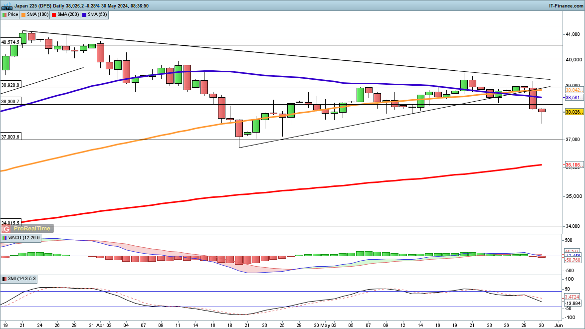 Wednesday’s session brought significant losses for the Nikkei 225, resulting in a close well below the trendline support established from the April low. The price reached a three-week low, and Thursday’s trading saw further declines, briefly hitting a one-month low. While buyers have stepped in at today’s session lows, they will need to push the price back above 38,300 to suggest some stabilization.