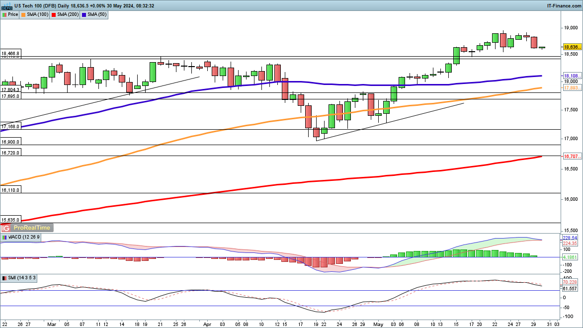 Strength in technology stocks has so far shielded the Nasdaq 100 from the severe losses experienced by the Dow in the latter half of the month. The index remains close to its previous highs, and a close above 18,800 could signal the beginning of a new upward move towards 19,000.